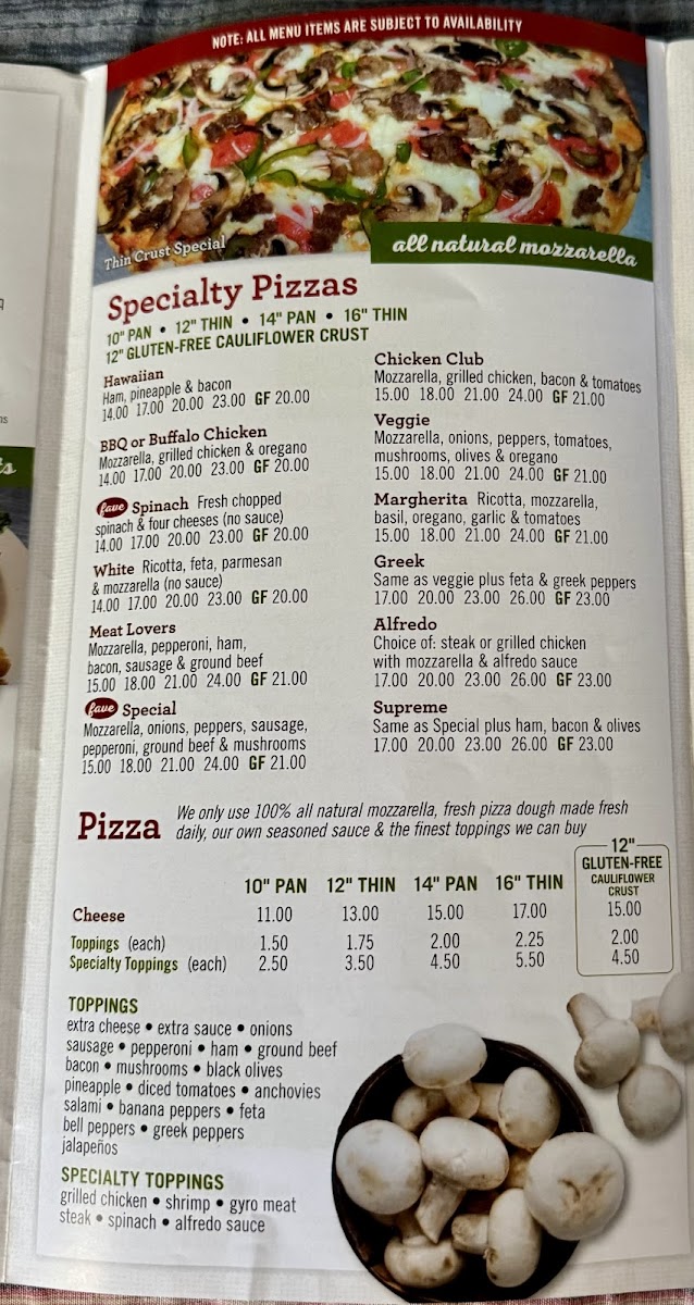 extra cheese, extra sauce, onions, sausage, pepperoni, ham, ground beef, mushrooms, black olives, pineapple, sliced tomatoes, anchovies, salami, banana peppers, feta cheese, bell peppers, Greek peppers, bacon