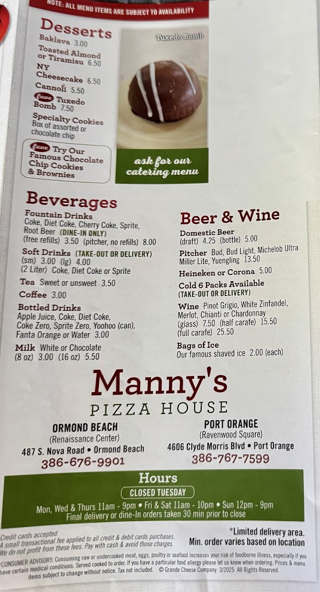 Welcome to Manny's Pizza House VI, a hidden gem located at 4606 S Clyde Morris Blvd, Port Orange, FL. This delightful pizza house offers a diverse menu that caters to every palate. Start your meal with tantalizing appetizers like Chicken Tenders or the mouthwatering Manny's Sampler, featuring chicken strips, cheese sticks, and poppers.